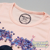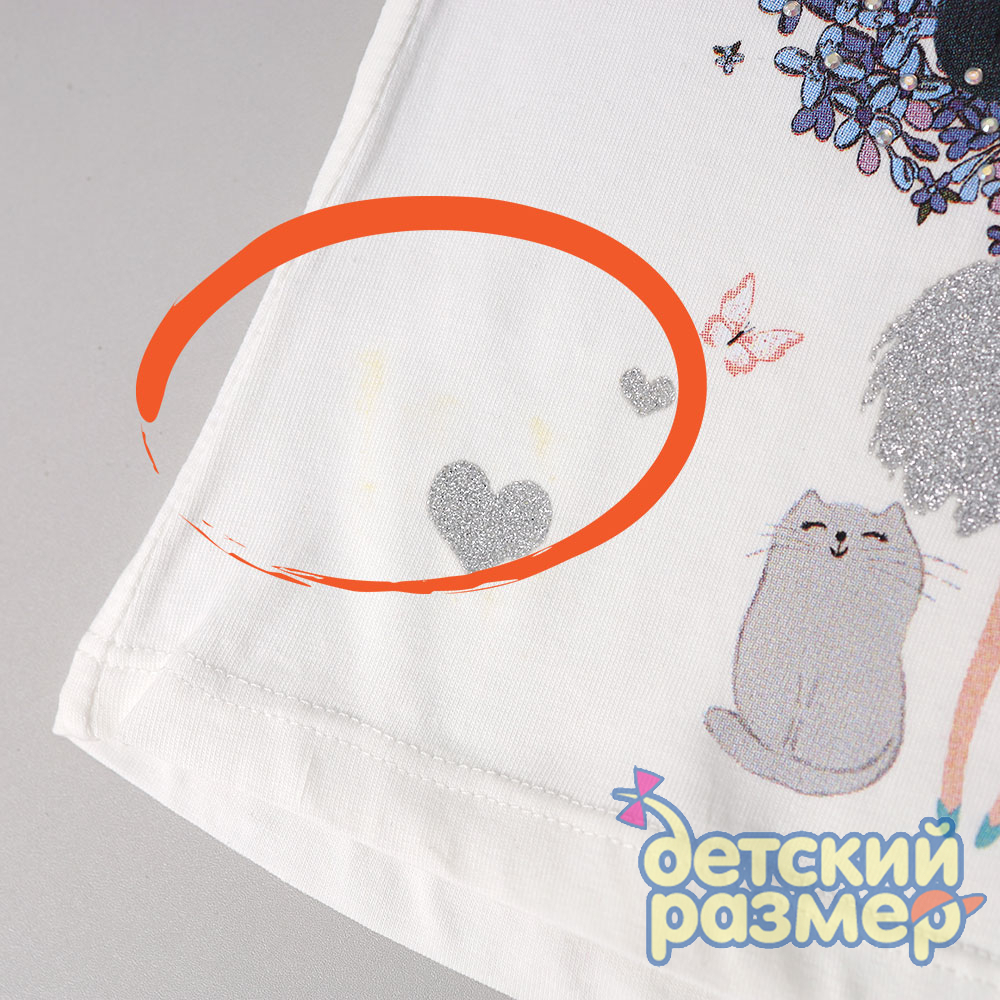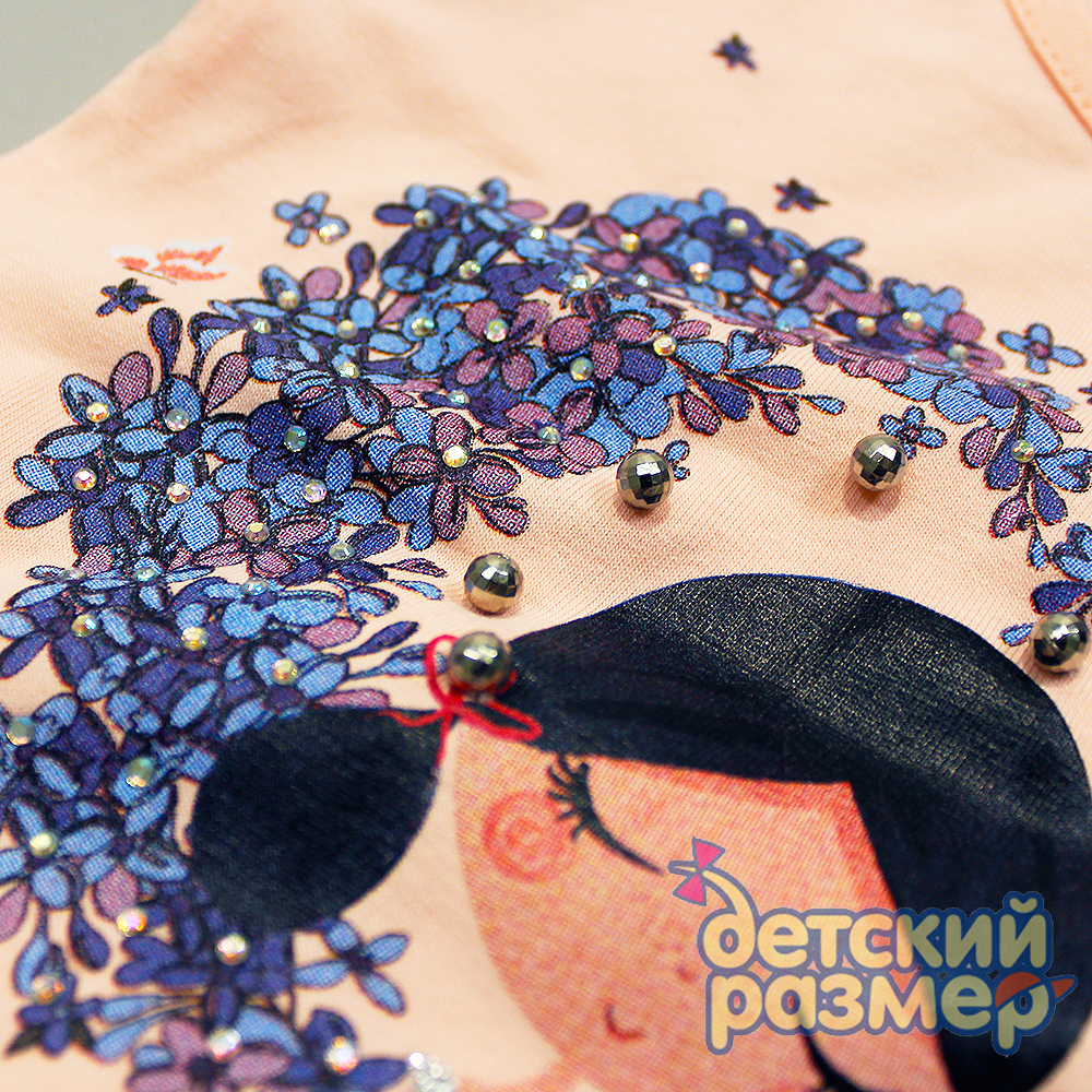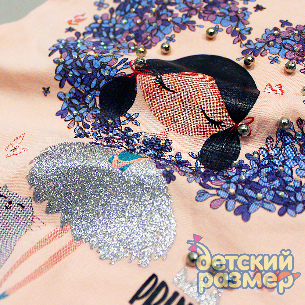 - на груди украшена ярким принтом с девочкой и цветочками (принт дополнен блестками и бусинками)