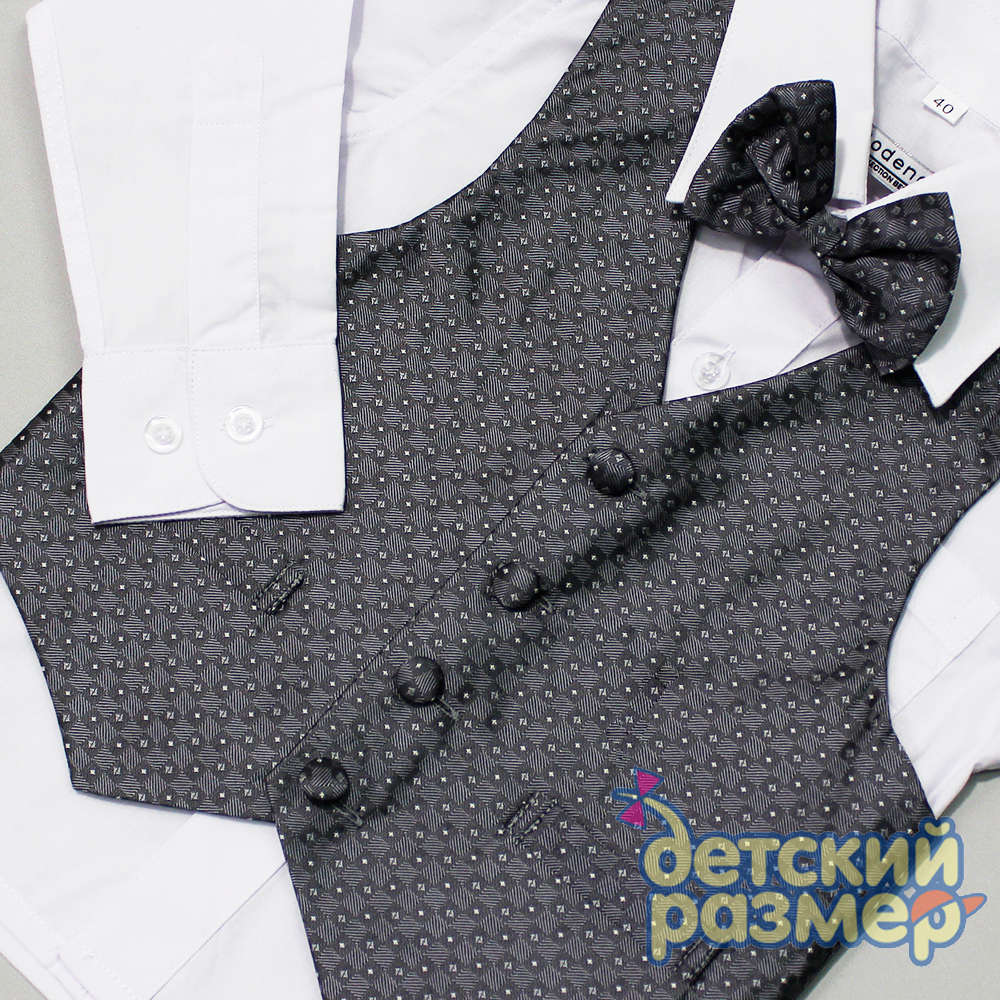 - очень стильный жилет (плотный текстильный материал с небольшим отливом, на тонком гладком подкладе) с узором и бабочкой на резинке в тон