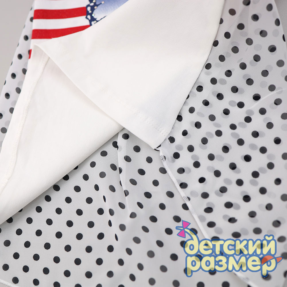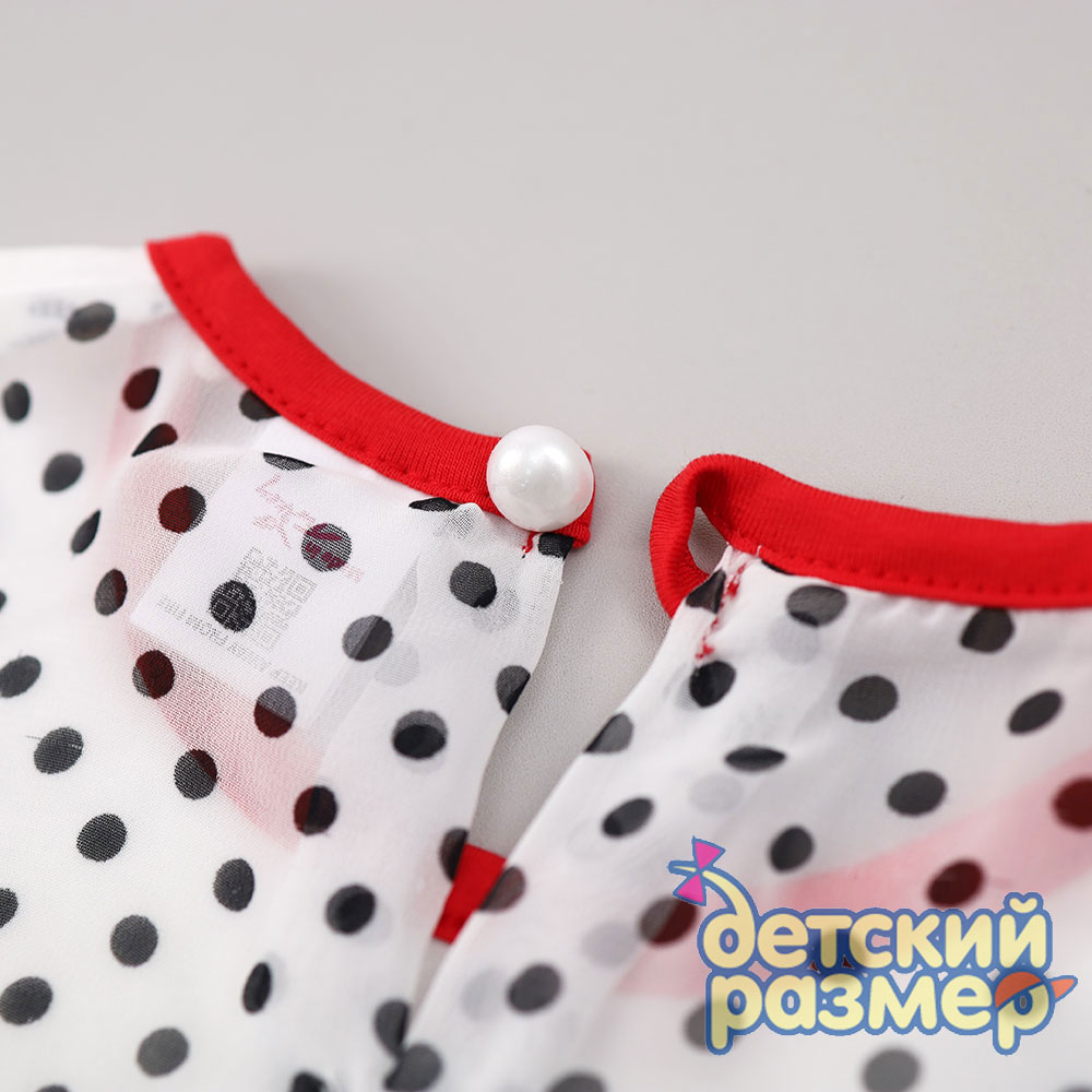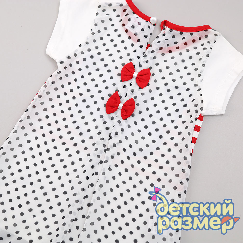 - слегка приталенная футболка, спинка из воздушного шифона в горошек с бантиками и пуговкой