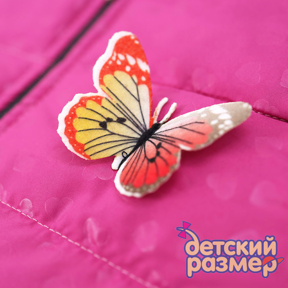 - украшена аппликацией в виде красивой бабочки и принтом в маленькое сердечко